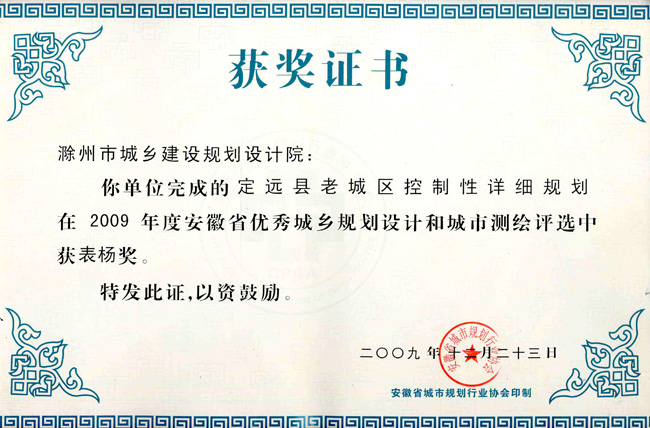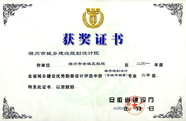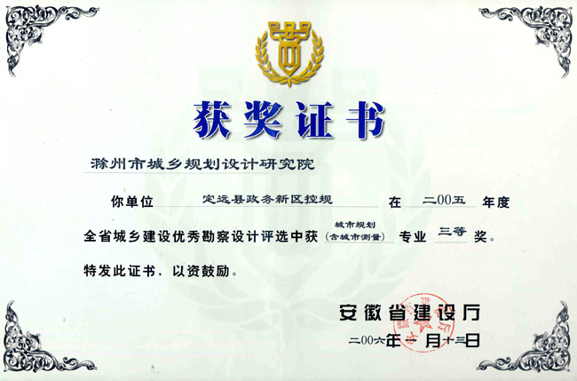 滁州市經(jīng)開區(qū)地形圖測繪規(guī)劃獲獎證書