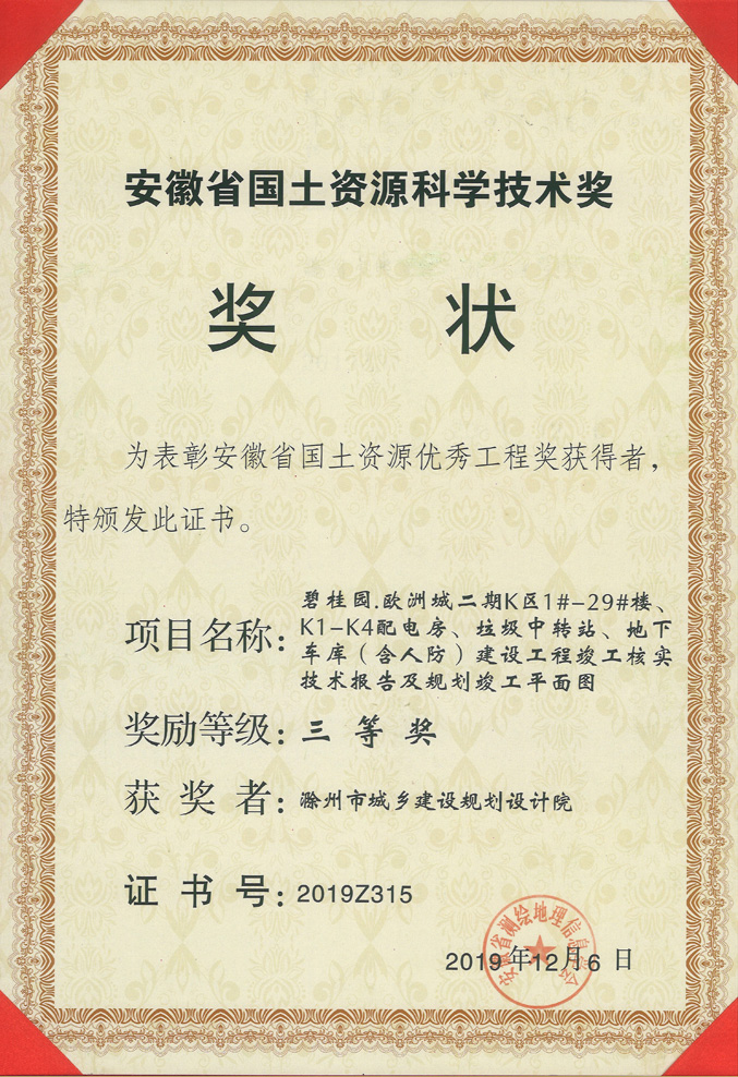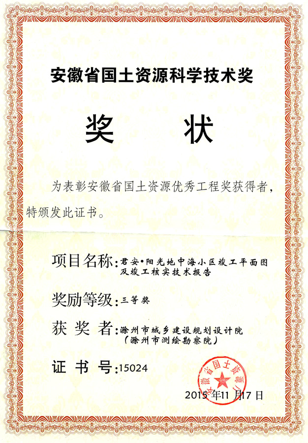 滁州市經(jīng)開區(qū)地形圖測(cè)繪規(guī)劃獲獎(jiǎng)證書